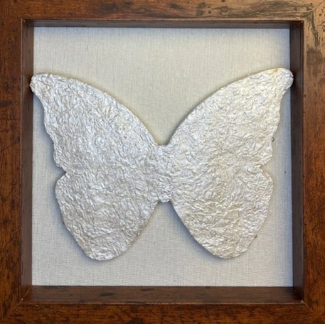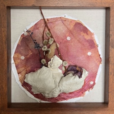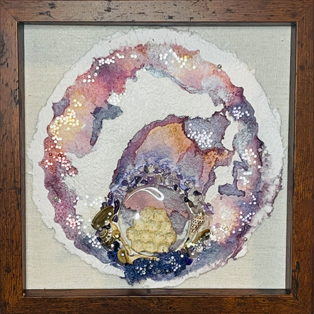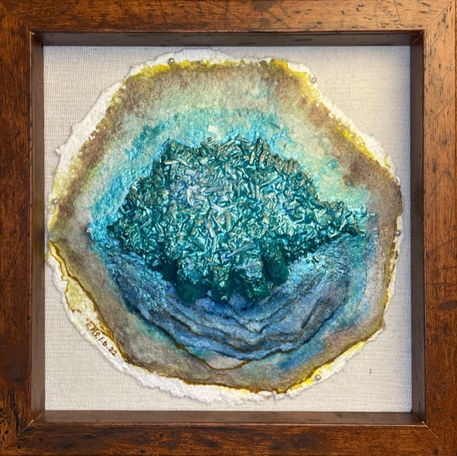 Acting as both an exploratorium and a herbarium, “Up Close: Blooming Earth” brings us intimately close to the Greening, a term by the Christian mystic, Hildegard of Bingen, Germany. The body of work was initiated in 2021 and exhibited in 2024. The body of work contains 21 paintings which are each framed in a 10x10x1 inch shadow box frame. Each piece comes with its own handheld magnifying glass. The handheld allowed visitors and owners of each painting to look closely and see how mycelium grows together in layers. Like early explorers, you will find that each painting highlights the use of mycelium as a medium. Mycelium is the soil-like substrate that fruits mushrooms, also known as the “Wood Wide Web.” Through the mycelial network, messages are sent through the mycelium living under, inside and all around trees and all plant life. This substrate shares 50% of our DNA. (Merlin Sheldrake, Entangled Life) This invites you to learn more about the natural treasures found deep within our earth. Bees, Butterflies, dragonflies, frogs, fungi, hummingbirds, and addition to species of mushrooms such as basket stinkhorns, orange mycena and even an underwater, gilled mushroom found in 2005 in Crater Lake, Oregon named Psathyrella Aquatica, all rely on mycelium and its information provided by tree networks and plants alike.