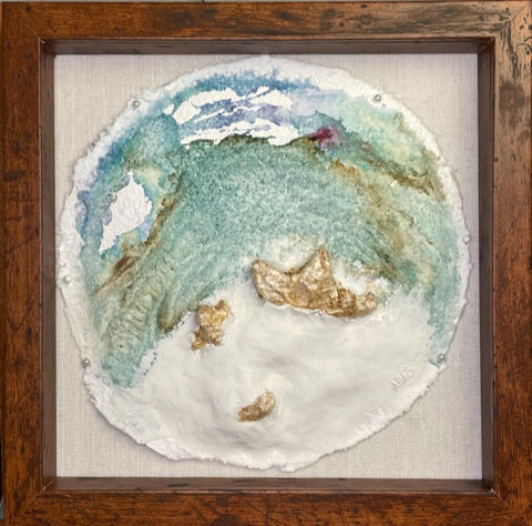 Acting as both an exploratorium and a herbarium, “Up Close: Blooming Earth” brings us intimately close to the Greening, a term by the Christian mystic, Hildegard of Bingen, Germany. The body of work contains 21 paintings which are each framed in a 10x10x1 inch shadow box frame. Each piece comes with its own handheld magnifying glass. The handheld allowed visitors and owners of each painting to look closely and see how mycelium grows together in layers. Like early explorers, you will find that each painting highlights the use of mycelium as a medium. Mycelium is the soil-like substrate that fruits mushrooms, also known as the “Wood Wide Web.” Through the mycelial network, messages are sent thtrough the mycelium living under, inside and all around trees and all plant life. This substrate shares 50% of our DNA. (Merlin Sheldrake, Entangled Life) This invites you to learn more about the natural treasures found deep within our earth. Butterflies, fungi, bees, frogs, hummingbirds, and dragonflies addition to species of mushrooms such as orange mycena, basket stinkhorns, and even an underwater, gilled mushroom found in 2005 in Crater Lake, Oregon titled Psathyrella Aquatica, all rely on mycelium and its information provided by tree networks and plants alike.